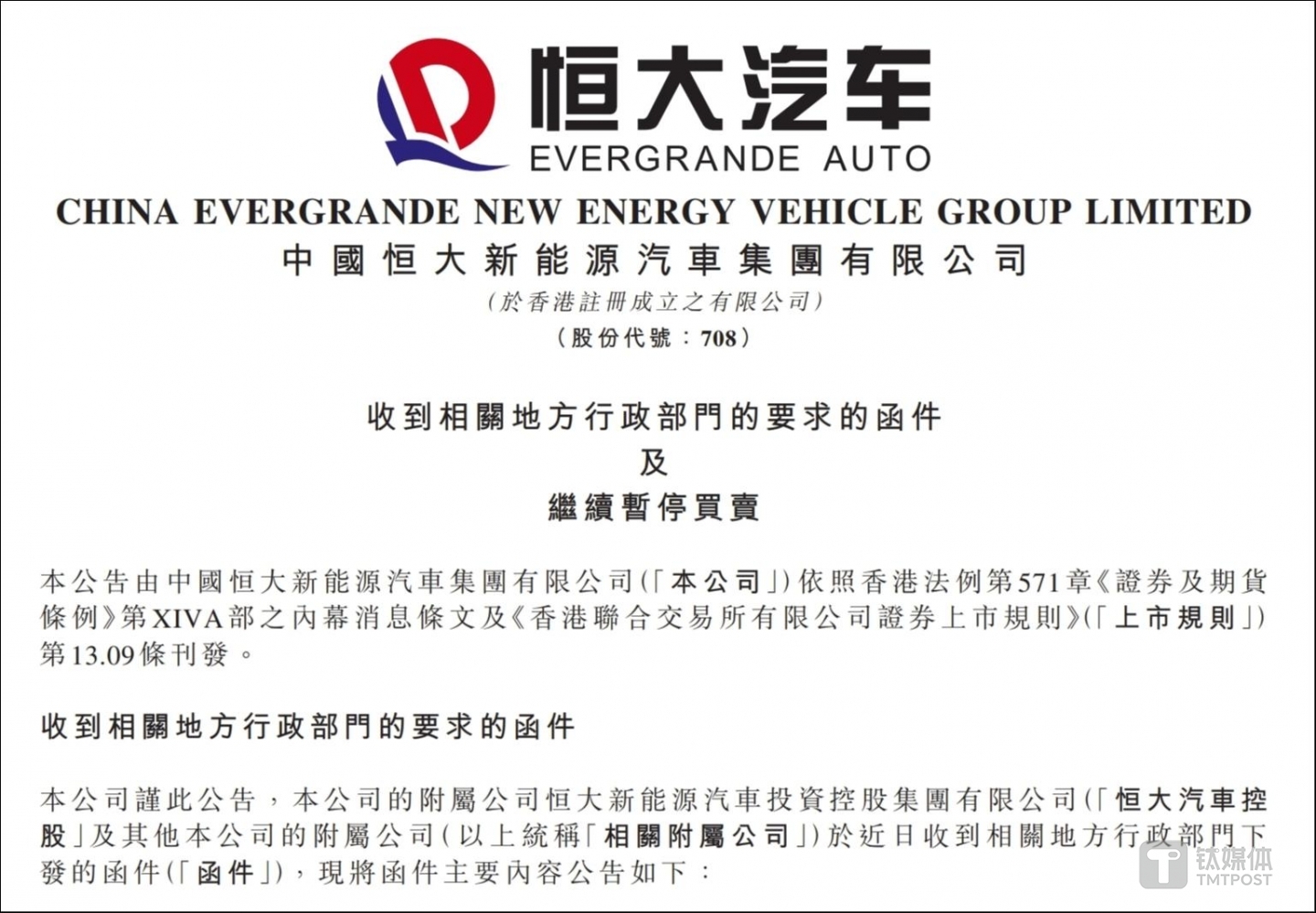 恒大汽车坦言,若上述要求最终执行,将对公司及各相关附属公司的财务状况和经营产生重大不良影响。同时,公司股票将继续暂停买卖,直至另行通知。