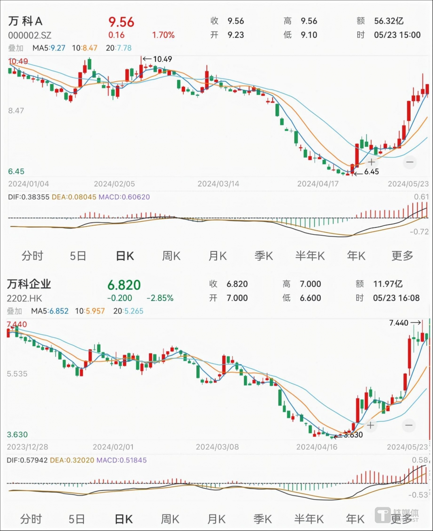 H股方面,截至5月23日港股收盘,万科企业(02202.HK)股价报收6.82港元,较4月19日的年内低值3.63港元已提升87.88%。
