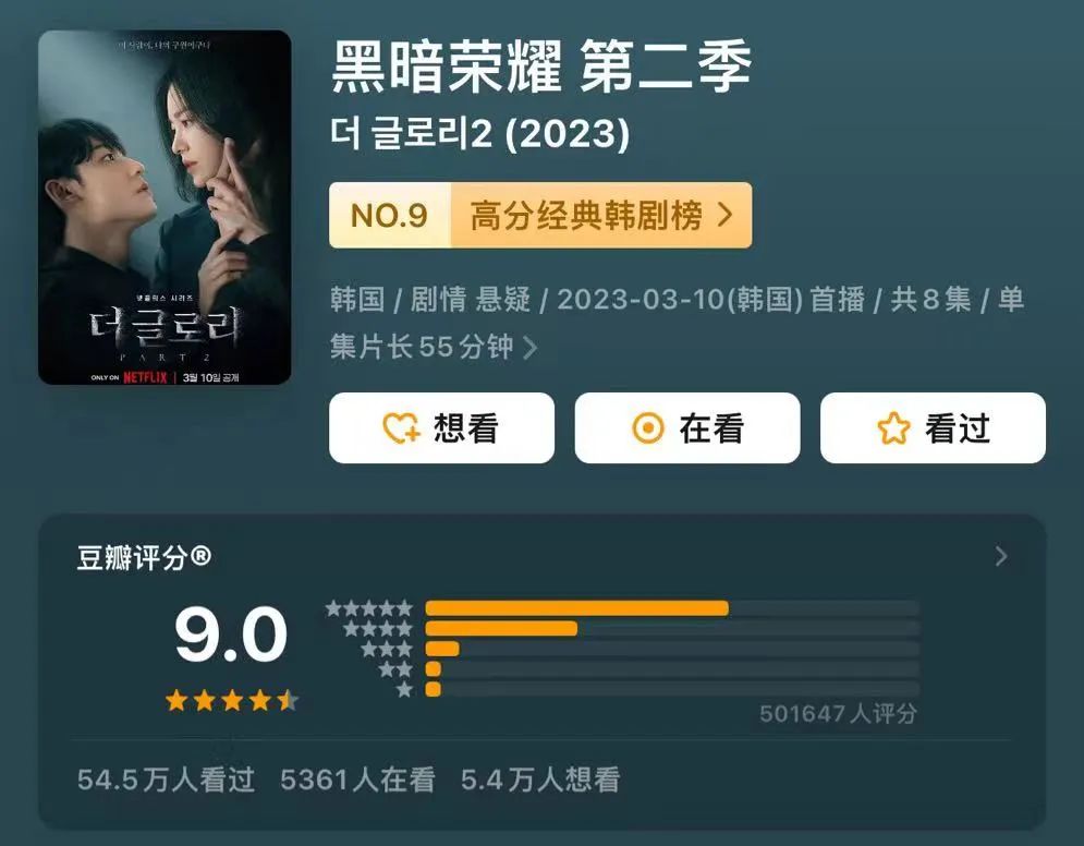 日韩市场的迷你剧发展同样较为迅速,甚至开始成为常态。最近的一个代表性例子是2022年底播出的《黑暗荣耀》,共8集,每集50分钟,一共两季,但间隔不到三个月,最终拿下豆瓣9.0高分。