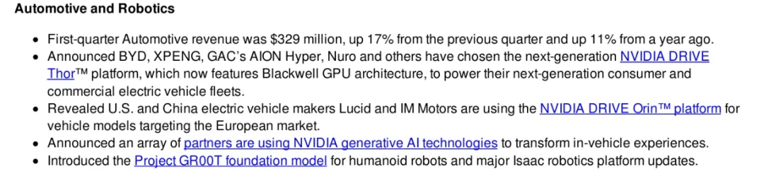 能够确定的是,作为汽车业务收入的支柱,中国汽车品牌会继续选择英伟达。比亚迪、小鹏、极氪、理想、昊铂、智己都已官宣采用英伟达Thor芯片,其中智己等品牌还计划将搭载Orin芯片的汽车出口到欧洲。