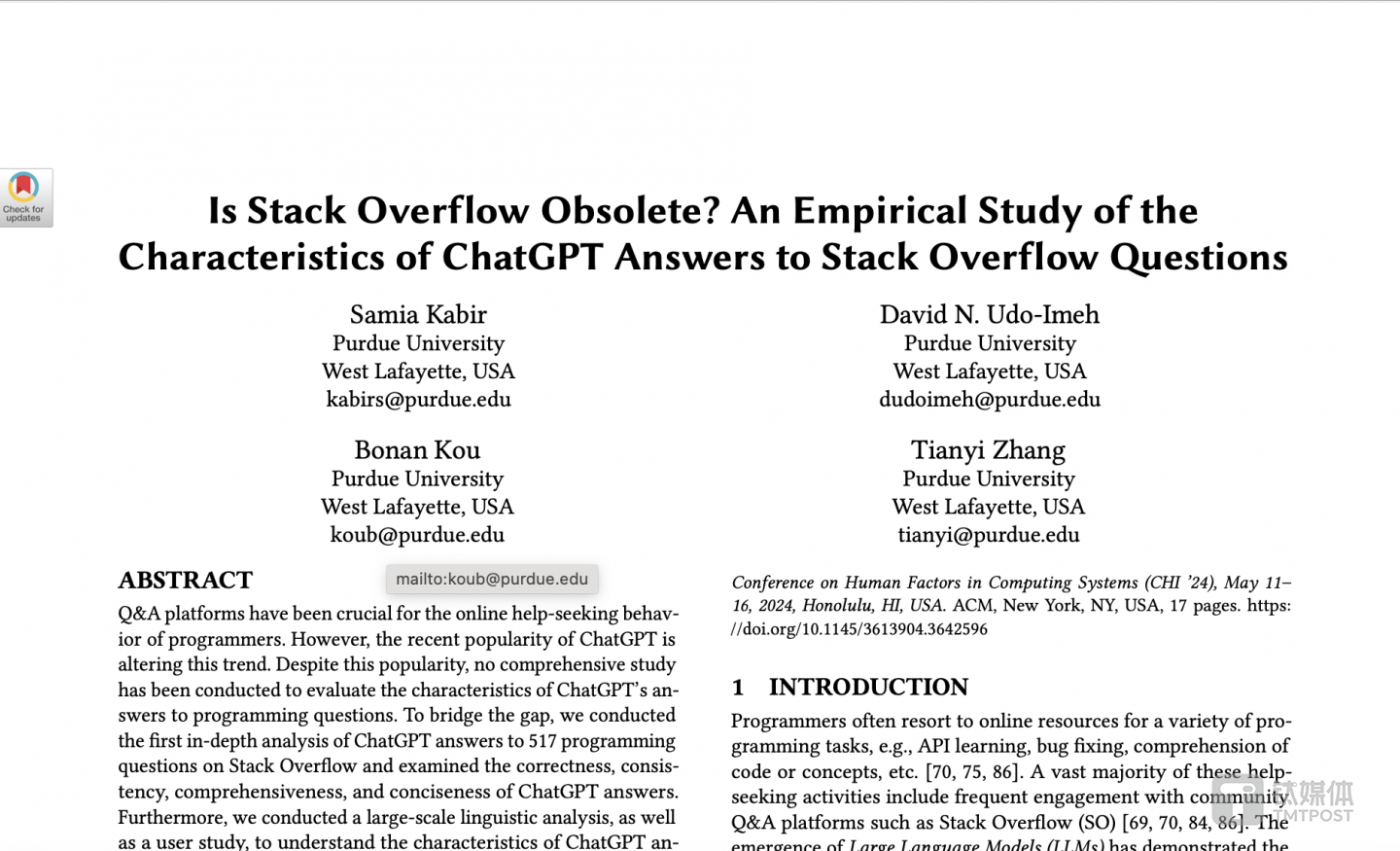 这篇共计17页的论文当中,研究人员深入分析ChatGPT对Stack Overflow上517个编程问题的回答,考察了这些回答的正确性、一致性、全面性和简洁性。尽管研究发现ChatGPT回答存在错误信息,但研究参与者当中,仍有35%的时间倾向于选择ChatGPT的回答,因为它们全面且语言表达清晰。