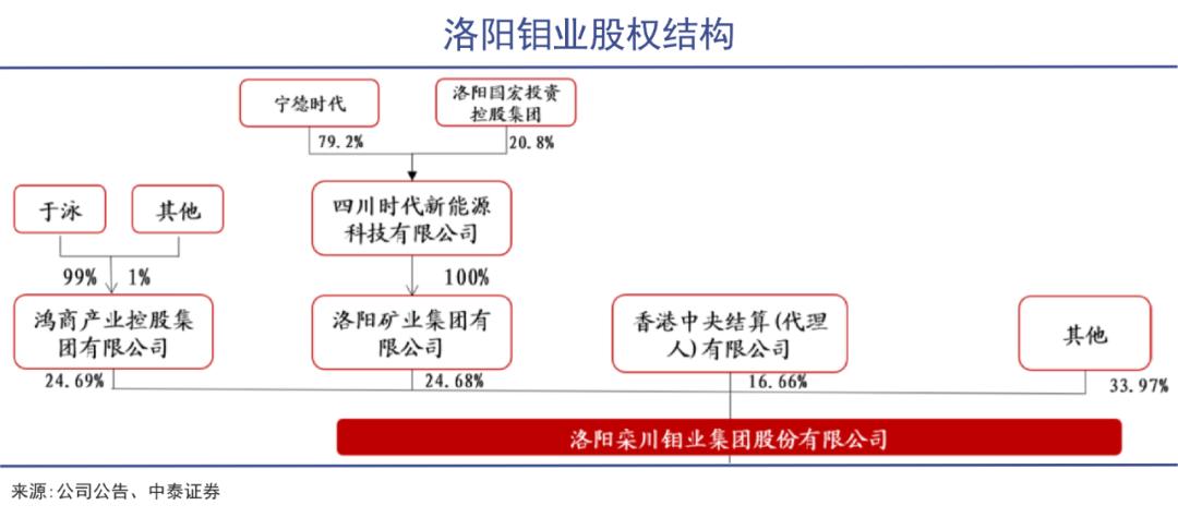 2022年10月,双方关系进一步加强,宁德时代通过子公司四川时代增资引入洛阳钼业控股股东洛阳国宏,从而获得洛阳钼业24.68%股份,成为第二大股东。和于泳控制的鸿商产业集团仅相差0.01个百分点。