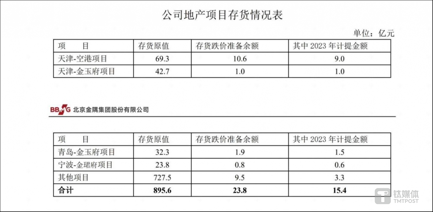 据悉,截至2023年12月31日,公司房地产项目原值895.6亿元,存货跌价准备余额23.8亿元,其中计提存货跌价准备15.4亿元,包括天津-空港项目、天津-金玉府项目、青岛-金玉府项目、宁波-金郡府项目及其他项目。