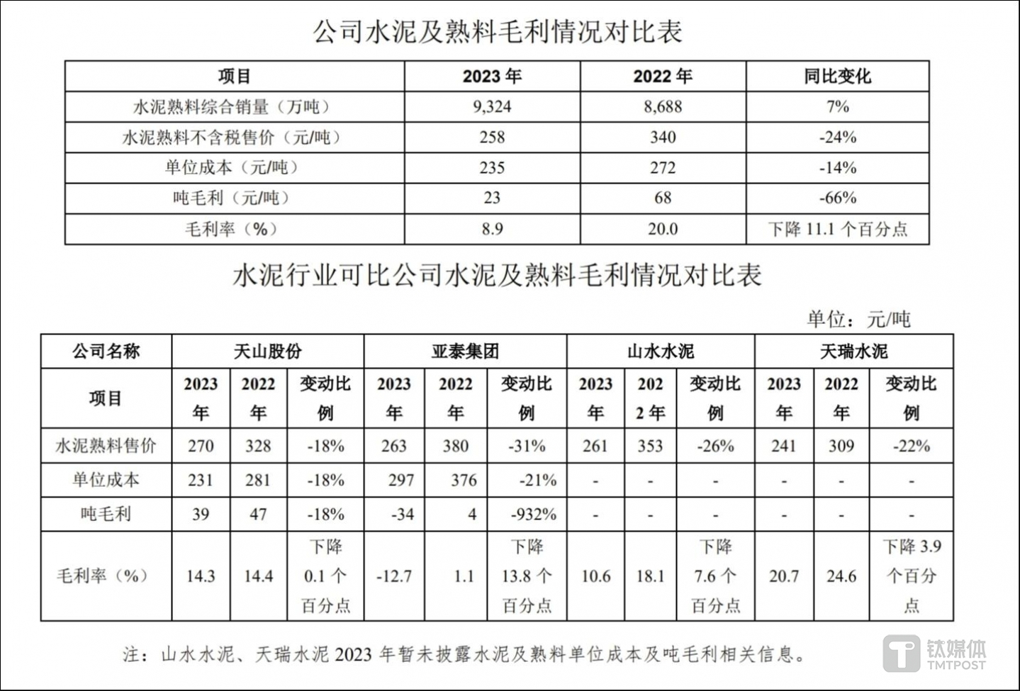 在回函中,金隅集团指出,2023年公司新型绿色环保建材板块实现收入795亿元,毛利率减少4.6个百分点,主要受水泥及熟料业务毛利率减少11.1个百分点影响。2023年市场需求弱势下行,降价抢量导致价格持续大幅回落,国内水泥市场价格总体呈现前高后低、震荡调整的走势。