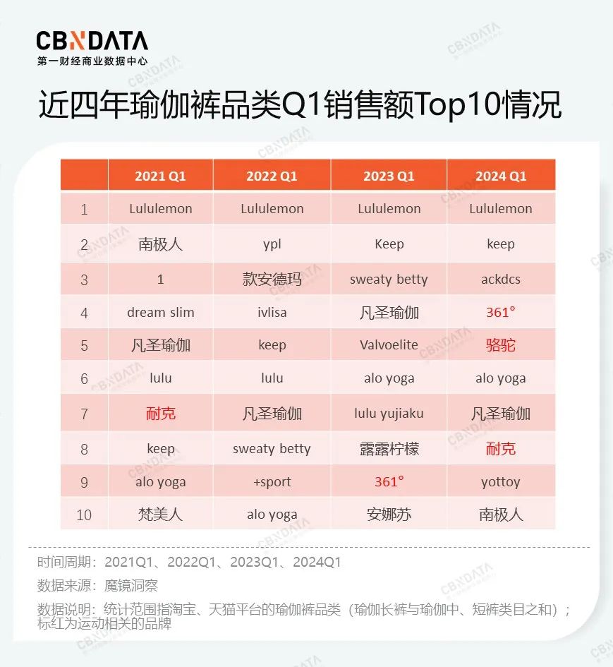 从今年Q1季度淘宝、天猫平台瑜伽裤品类销售额Top10最新排名来看,专业瑜伽服饰品牌lululemon排名第一,361°、骆驼、耐克纷纷涌现,运动品牌表现优异。