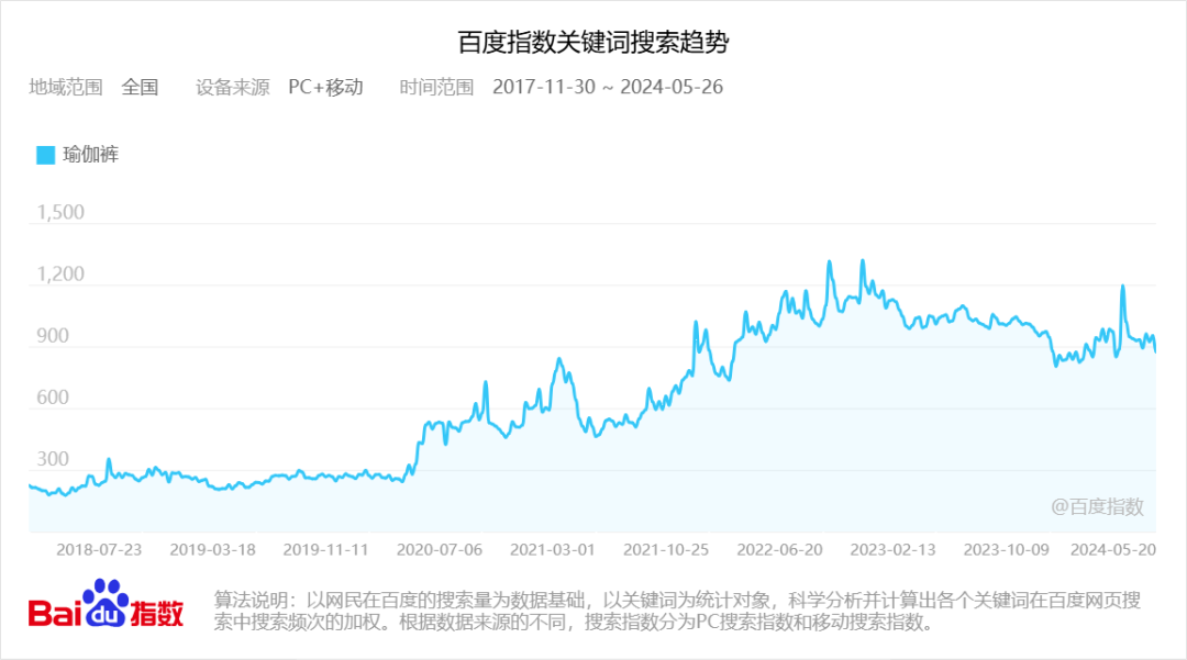 与之同步的是运动服饰市场的火热。部分服饰品类更是年年走红,比如瑜伽裤。百度指数“瑜伽裤”关键词搜索趋势显示,2021年起,“瑜伽裤”开始受到大众广泛关注,搜索指数持续攀升,并维持在较高水平(如今仍是2020年以前的3倍多)。今年3月,#瑜伽裤卖爆了的话题还冲上了微博热搜。