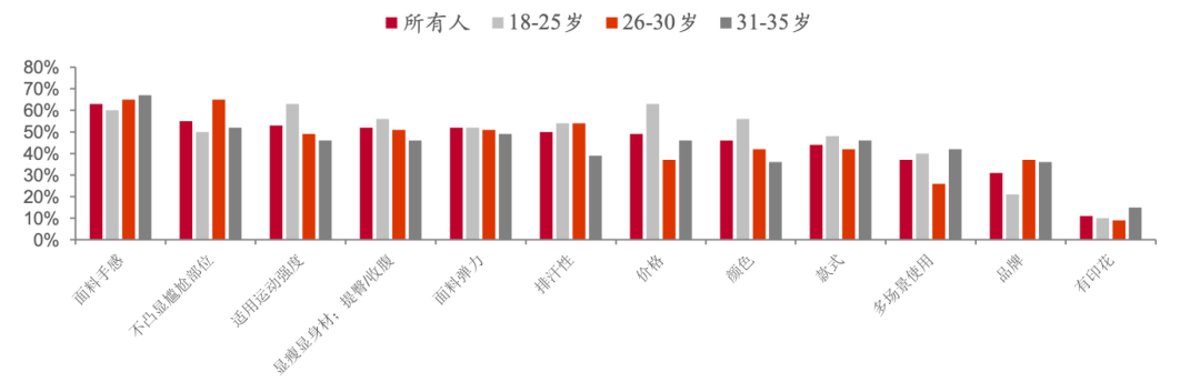 性价比之外,消费者对于瑜伽裤品类的需求正进一步延伸。中泰证券研究所调研显示,“面料手感”、“适用运动强度“超越”价格“”显瘦显身材“”颜色、款式“成为各年龄段女性消费者购买瑜伽裤的首要考虑因素。这说明,如今消费者对于瑜伽裤商品的品质、功能性上保有更多期待。