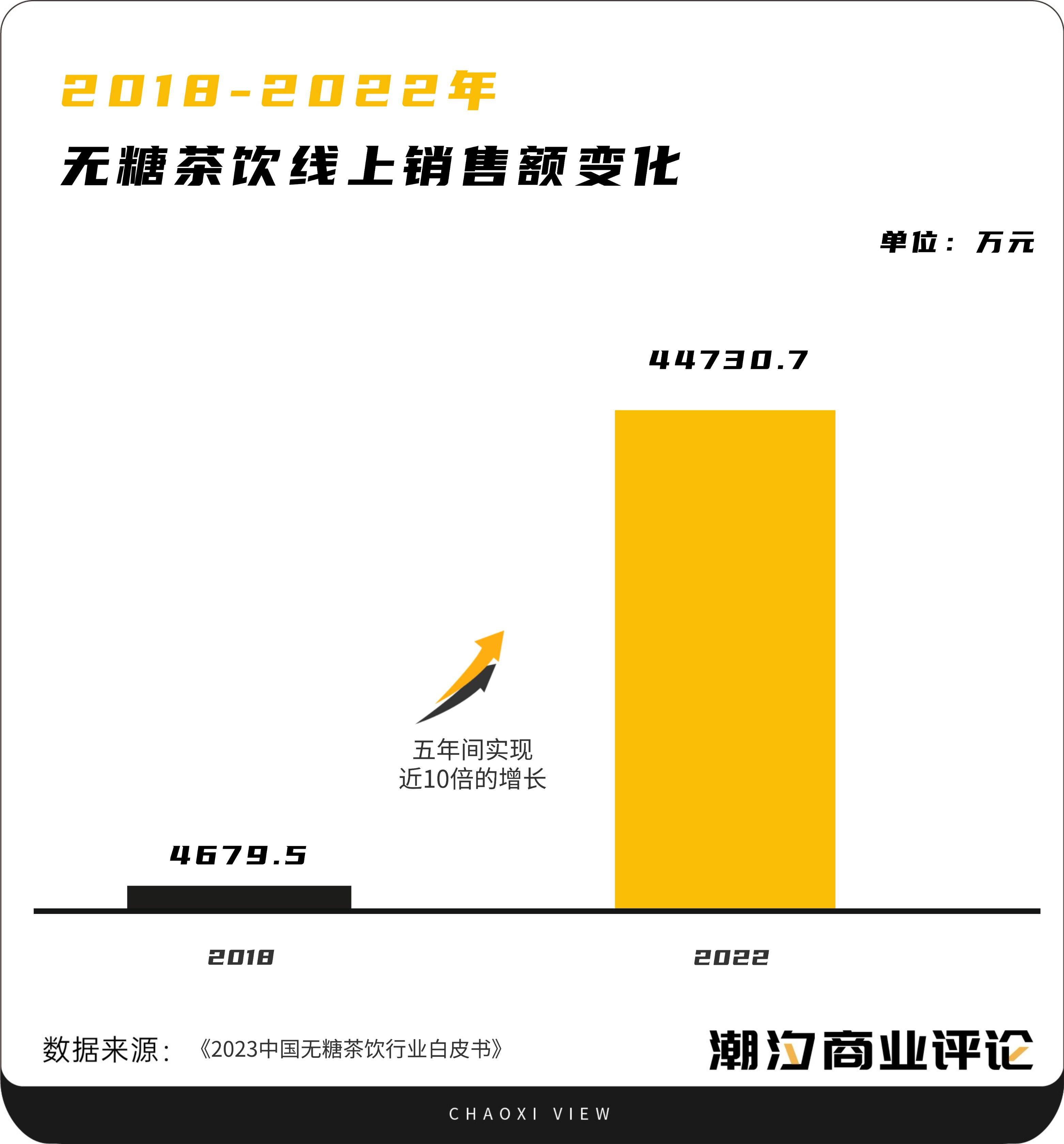 据亿欧智库发布的《2023中国无糖茶饮行业白皮书》,通过分析天猫淘宝平台近五年的无糖茶饮料销售额发现,无糖茶饮在线上的销售额从2018年的4679.5万元,到2022年达到44730.7万元,五年间实现了近10倍的增长。
