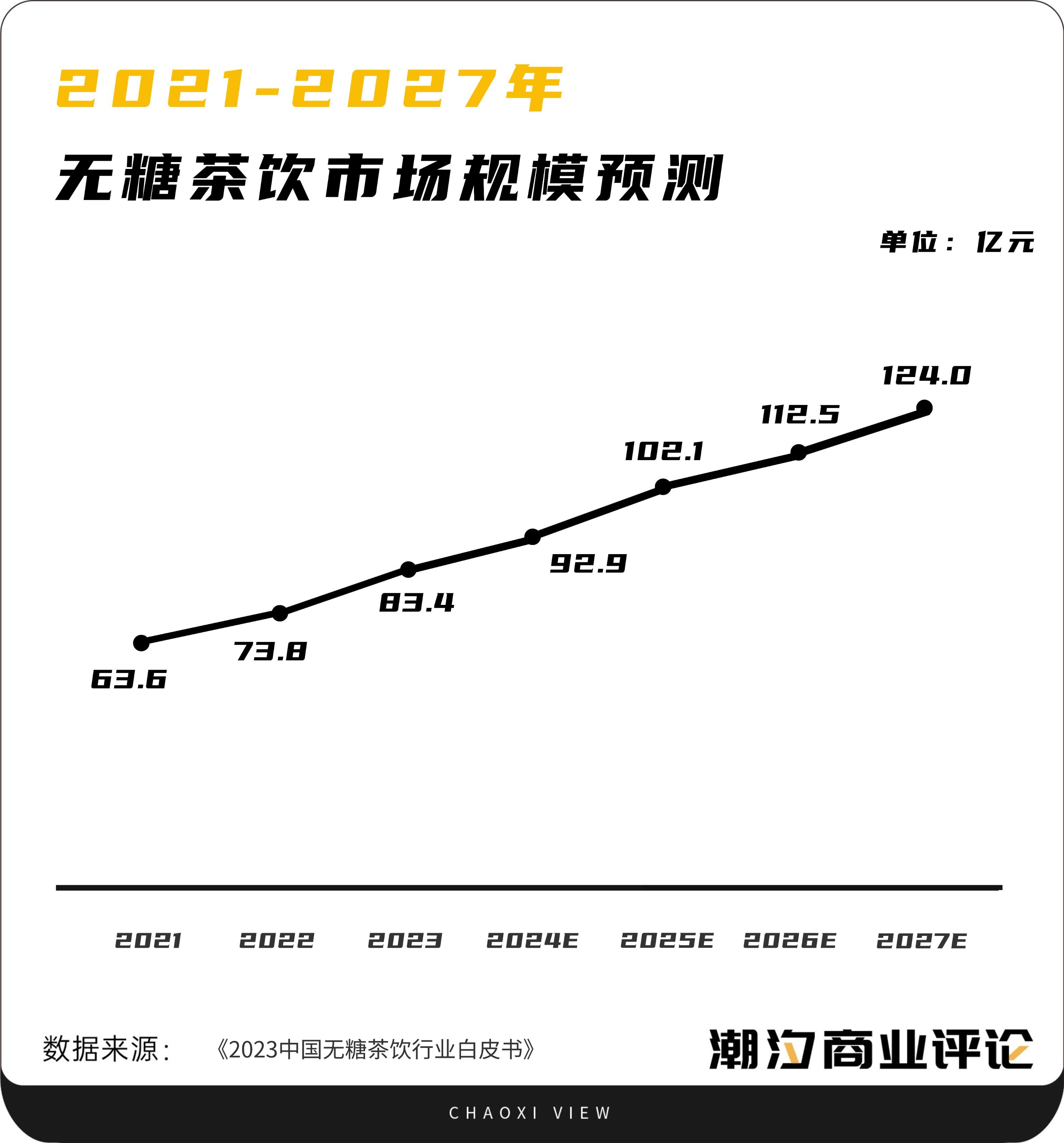 Euromonitor数据显示,预计到2027年,中国无糖茶饮市场规模将达到124亿元,未来五年,中国茶饮市场将进入无糖茶饮高速增长期。