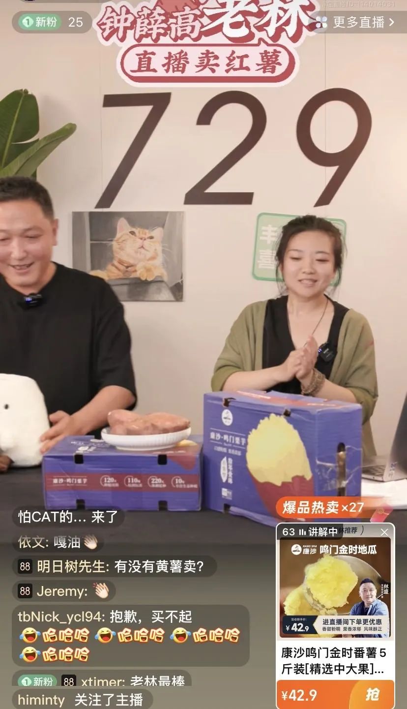 “雪糕刺客”之后,走进直播间的林盛又喜提了“红薯刺客”的称号。
