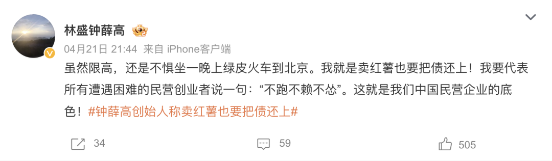林盛曾两次公开提到“卖红薯”。一次是今年4月21日,新浪财经CEO邓庆旭发微博称:钟薛高创始人林盛被“限高”后,坐了一晚上绿皮火车到北京。之后林盛发微博表示,“不惧坐一晚上绿皮火车到北京,就是卖红薯也要把债还上”。