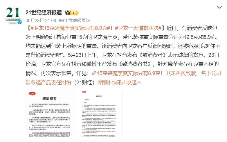 5月23日,卫龙一天内道歉两次,表示问题正在解决,欢迎消费者监督,同时邀请当事用户担任品牌质量监管大使,未来也将加强持续优化生产管理体系。