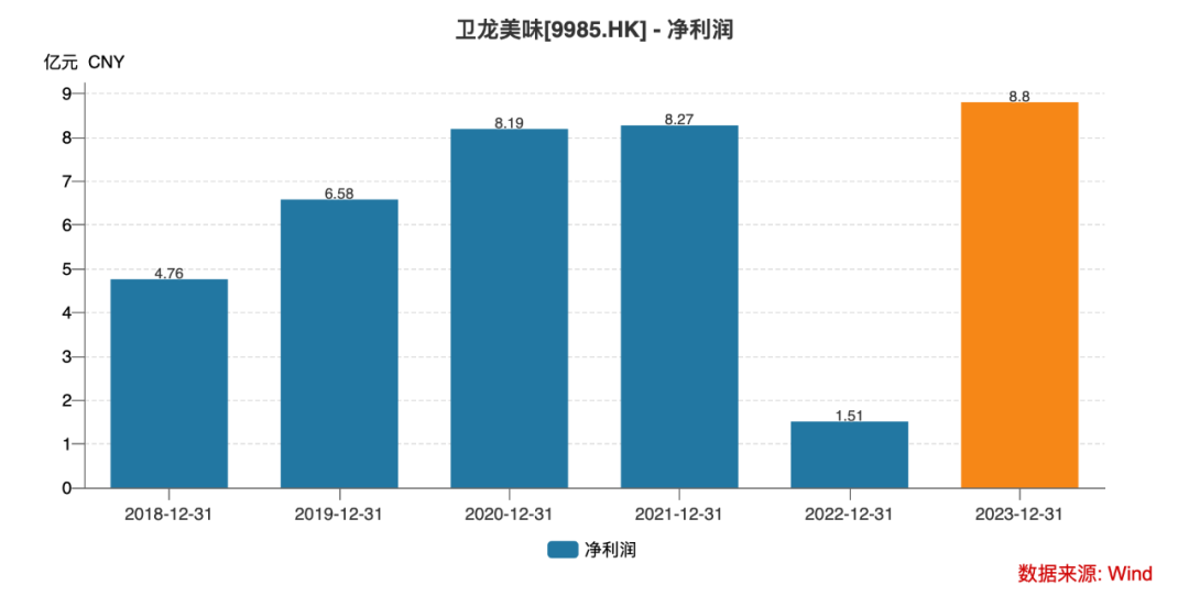 2021年,公司实现营收48.2亿元,但净利润只有8.27亿元,与上一年基本持平;2022年,卫龙净利润跌了近8成,只有1.51亿元。