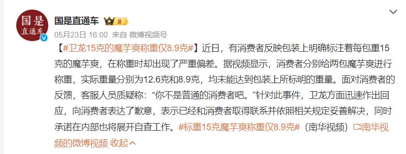 你对这次卫龙魔芋爽“缺斤短两”事件看法如何?