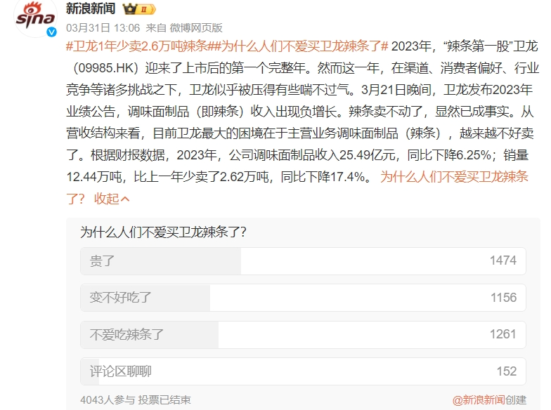 同时,卫龙还主打“新国货”和“情怀营销”。这些营销方式在平时或许能获取不少关注,但一旦出现问题,也可能面临大众情绪和网络流量的“反噬”。