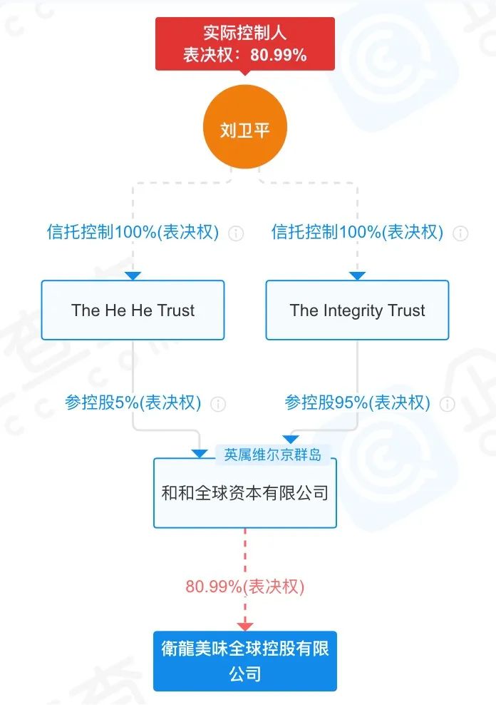 不过机构股东在卫龙的持股比例只有5.7%;截至2023年末,卫龙创始人刘卫平实控的和和全球资本有限公司,持有卫龙美味19.04亿股,持股比例80.99%;其中实际控制人刘卫平拥有卫龙80.99%的表决权。