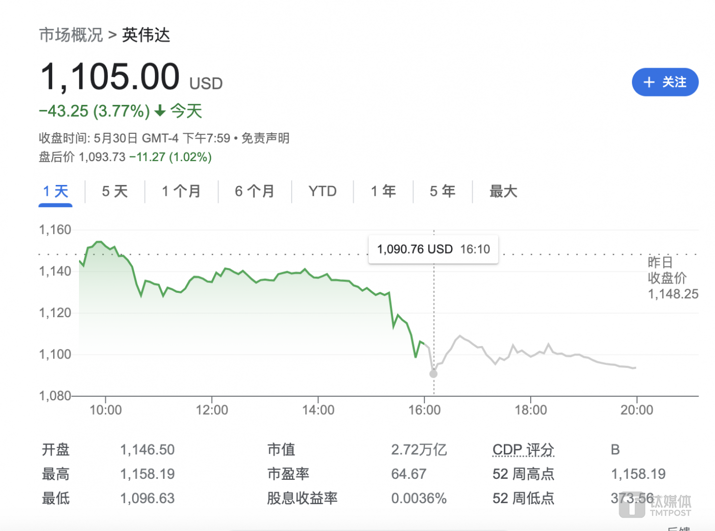 受此消息影响,英伟达和AMD股价下跌。截至美股5月30日(周四)16点收盘,英伟达股价跌3.8%,至1105美元/股,跌至当日最低点。与此同时,AMD回吐早前的涨幅,最终上涨不到1%,至166.75美元。