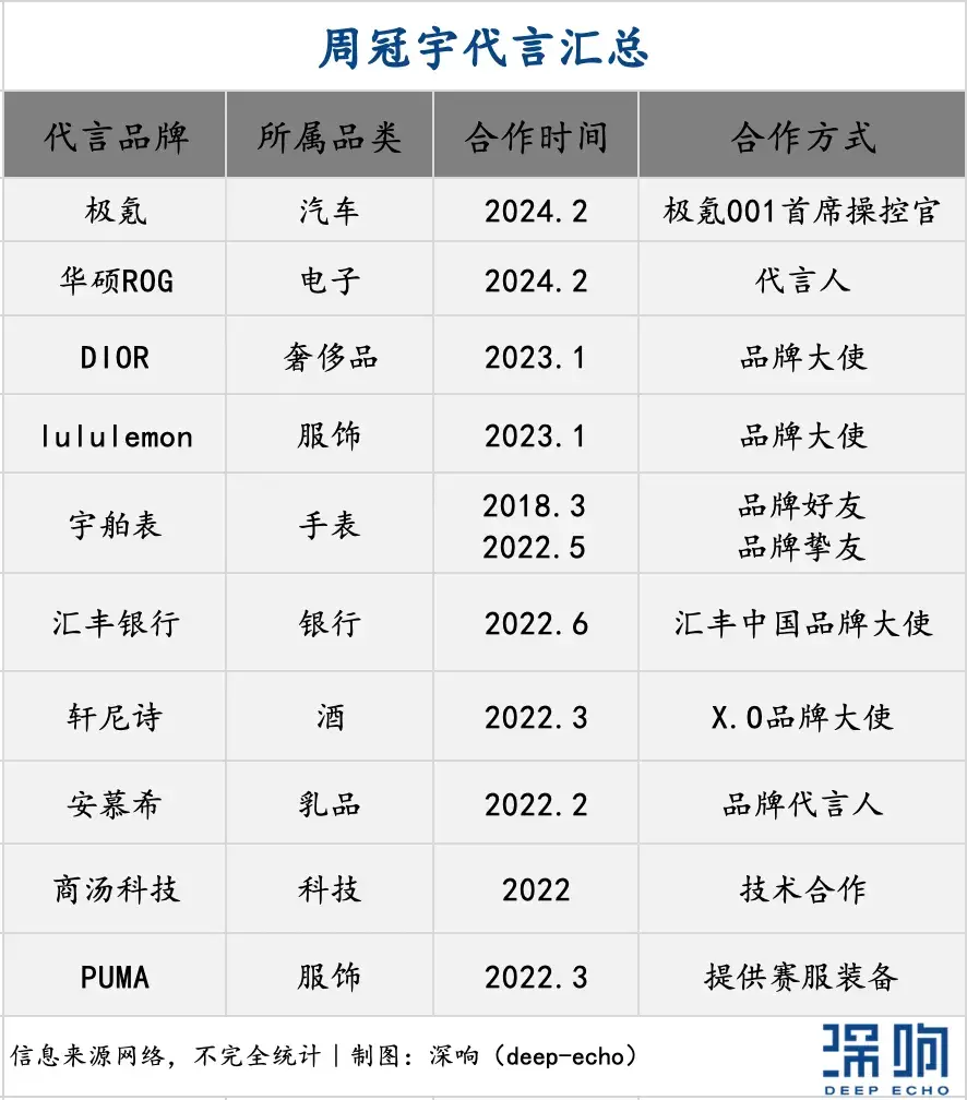 其中,F1车手周冠宇在四月完成上海主场比赛首秀后,一季度新增了极氪、ROG等品牌代言,再叠加之前的Dior、lululemon、宇舶表、轩尼诗、汇丰银行、安慕希,签约品牌共计十家,商业价值正在持续爆发。