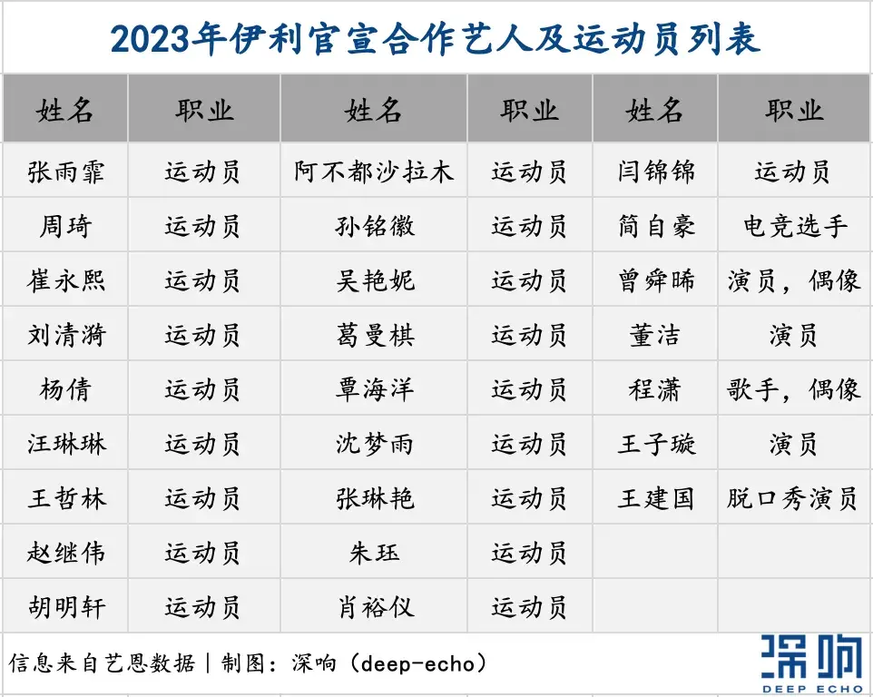第一,品牌“海投”,合作轻量。相比之前品牌对一位代言人“一投到底”的玩法,现在越来越多的品牌会赛事前签约多位运动员,艺恩数据显示,2023年伊利一口气签约了19位运动员,从夺冠热门到比赛新秀全都涉及。在代言头衔上,不少品牌会更倾向活动代言人、大使等短代。