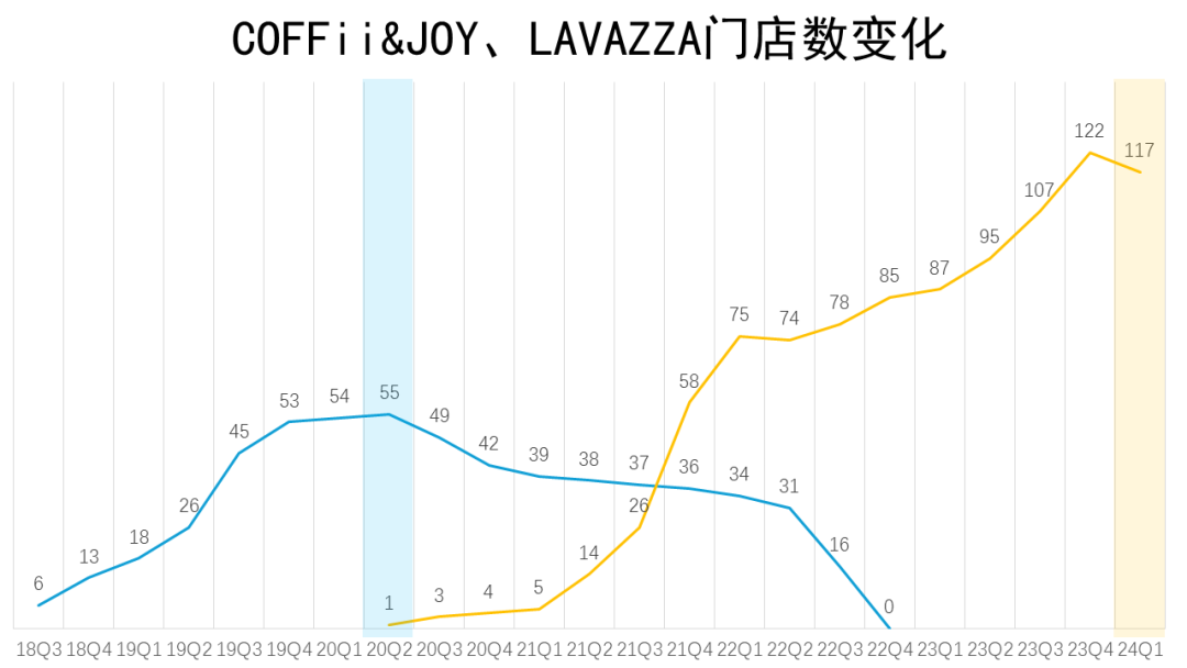 彼时坊间认为,百胜中国平价的K咖啡、精品的COFFii&JOY和高端咖啡Lavazza将共同布局咖啡市场。但从门店状况看,2020年第二季度Lavazza开出门店后,COFFii&JOY的门店规模就持续缩水,直到2022年第四季度完全淡出。