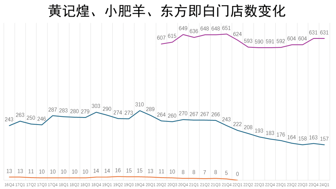 比起小肥羊,黄记煌的发展相对来说比较幸运。2014-2016年,黄记煌营收逐步下滑,此后,一度风传「倒闭」。2020年,百胜中国完成了对黄记煌的收购,黄记煌门店数从2020年6月的600多家,增至2024年一季度末的631家。