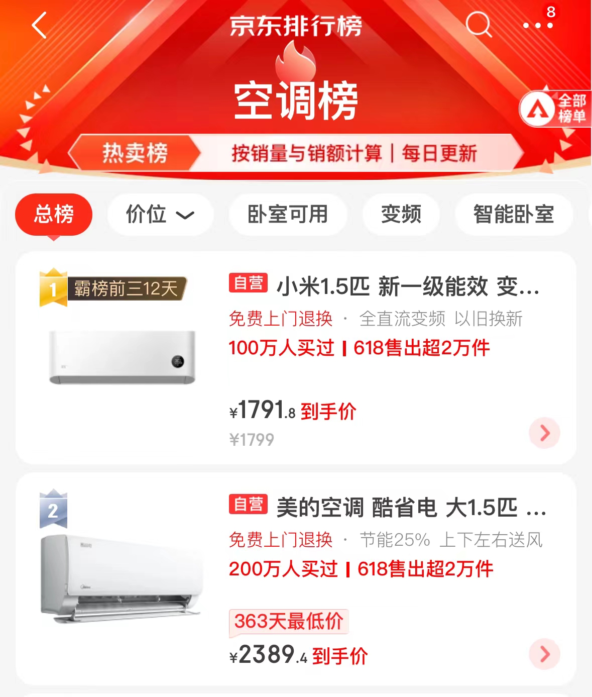 京东热销空调榜上,小米的巨省电系列1.5匹挂式空调占据榜首,15日内售出10万件,比位列榜单第二为的美的要多出整整一倍。但只看价格,格力是榜单前五名中售价最高的一款(2638元),这说明相比起极低的售价,消费者在选购空调这类生活家电时,也会考虑更多综合性能或是品牌效应。拼多多公开的618首周战报显示,美的、小米、华凌等品牌空调领跑行业,销量同比增超90%,家电品牌在百亿补贴频道越发受消费者认可。