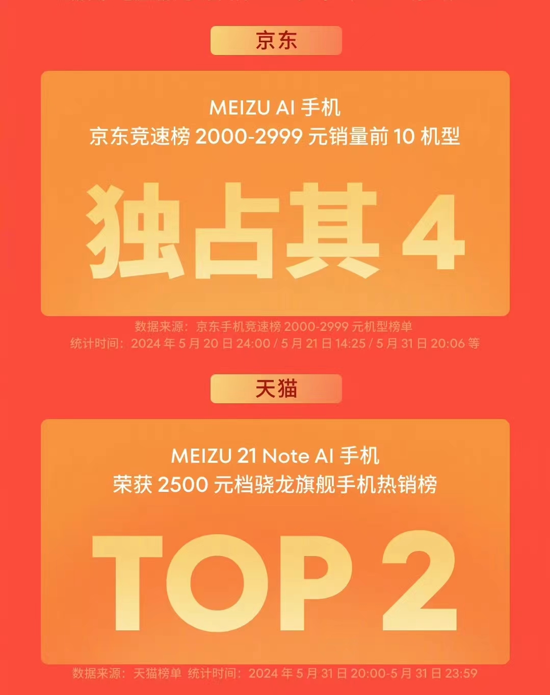 魅族手机今日公开的战报中显示,魅族AI手机魅友复购率达83%、在京东竞速榜、天猫热销榜中分别以独占前4和4K价位TOP2的好成绩,交出了AI手机在今年618的第一份答卷。此外,荣耀凭借今年在AI领域的发力,也成功拿下非常不错的成绩:荣耀200系列开门红线上各平台冠军、MagicBook Pro 16获线上各平台8K+价位轻薄本冠军、折叠屏家族销量同比增长269%。