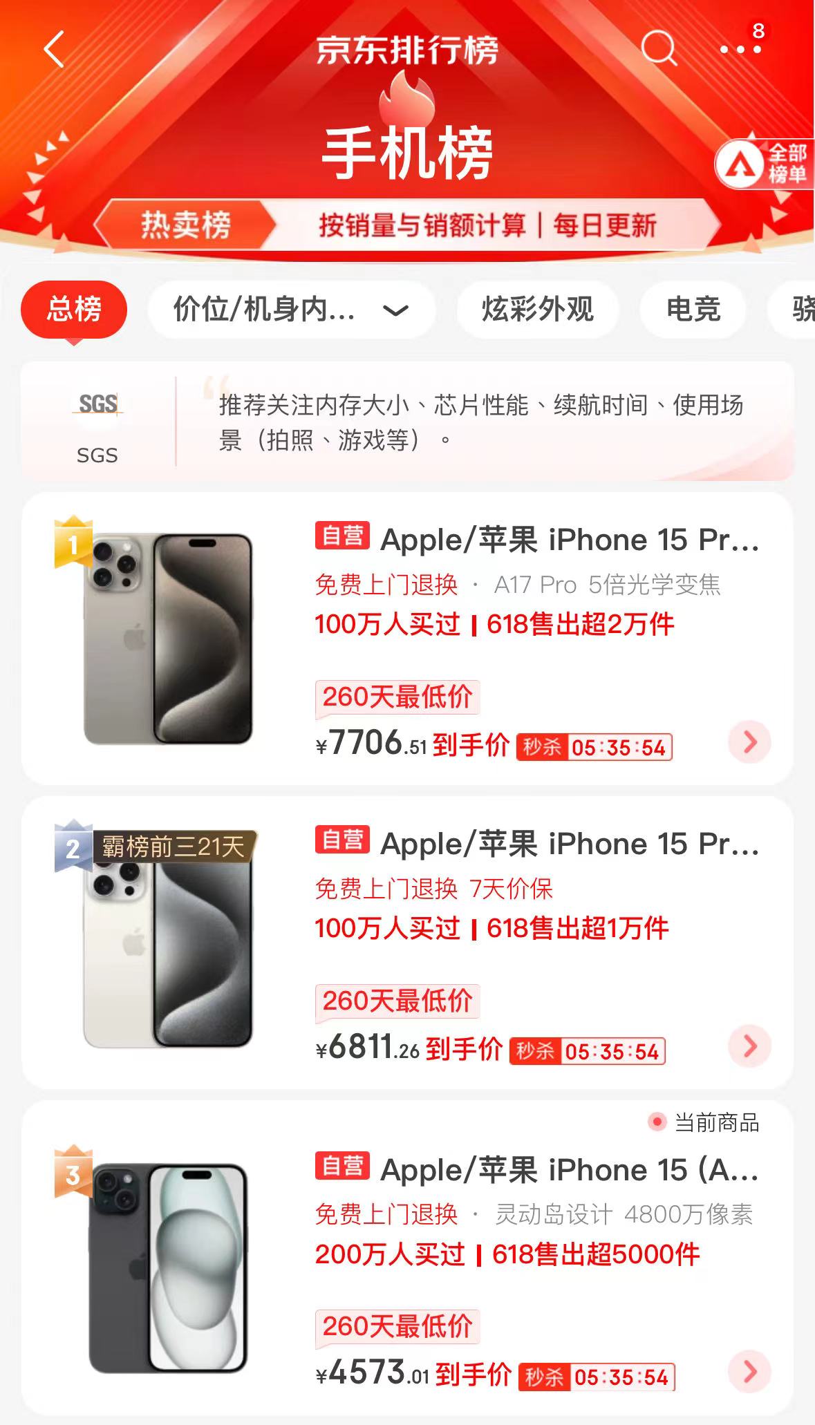 京东给出的618第一份综合战报中也揭露,苹果4小时交易额破亿,iPhone 15系列四款机型均在手机热卖榜上名列前茅。截至发稿前,手机热卖榜第一位为iPhone 15 Pro Max,第二位是iPhone 15 Pro,而iPhone 15则位居季军。