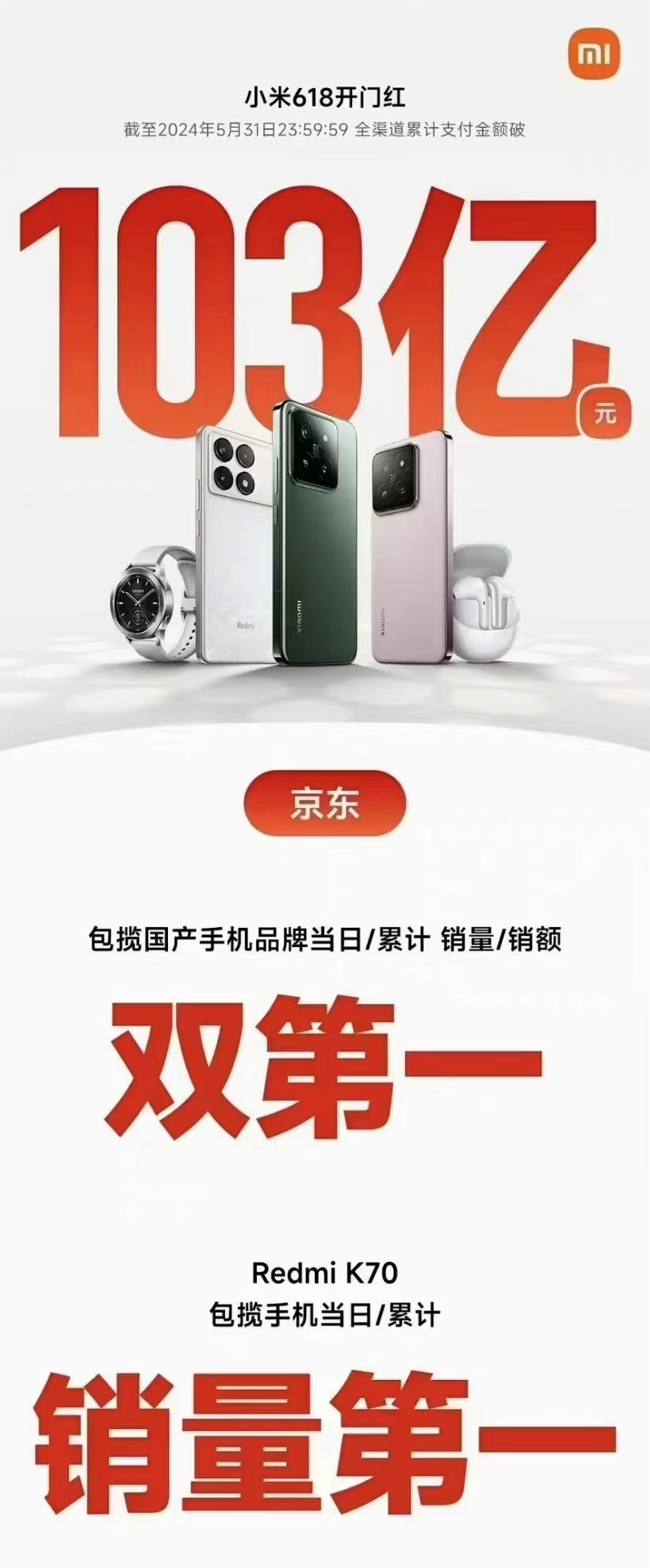 截至目前,小米、红魔、iQOO等品牌发布了618首轮战报,小米618开门红全渠道累计支付103亿元,小米14、小米13、Redmi K70分别拿下多项第一;iQOO 12、iQOO 12 Pro分别占领3K+档位、4K+档位的京东、天猫平台第一、第三名。