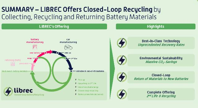 Librec研发了一种先进的废旧锂离子电池回收工艺,能达到90%的原材料回收率,可回收包括钴、锂、镍、铜、铝、锰、电解质、电子元件、外壳组件甚至石墨等原材料,并将其重新投入新电池生产,实现锂电池回收的闭环。