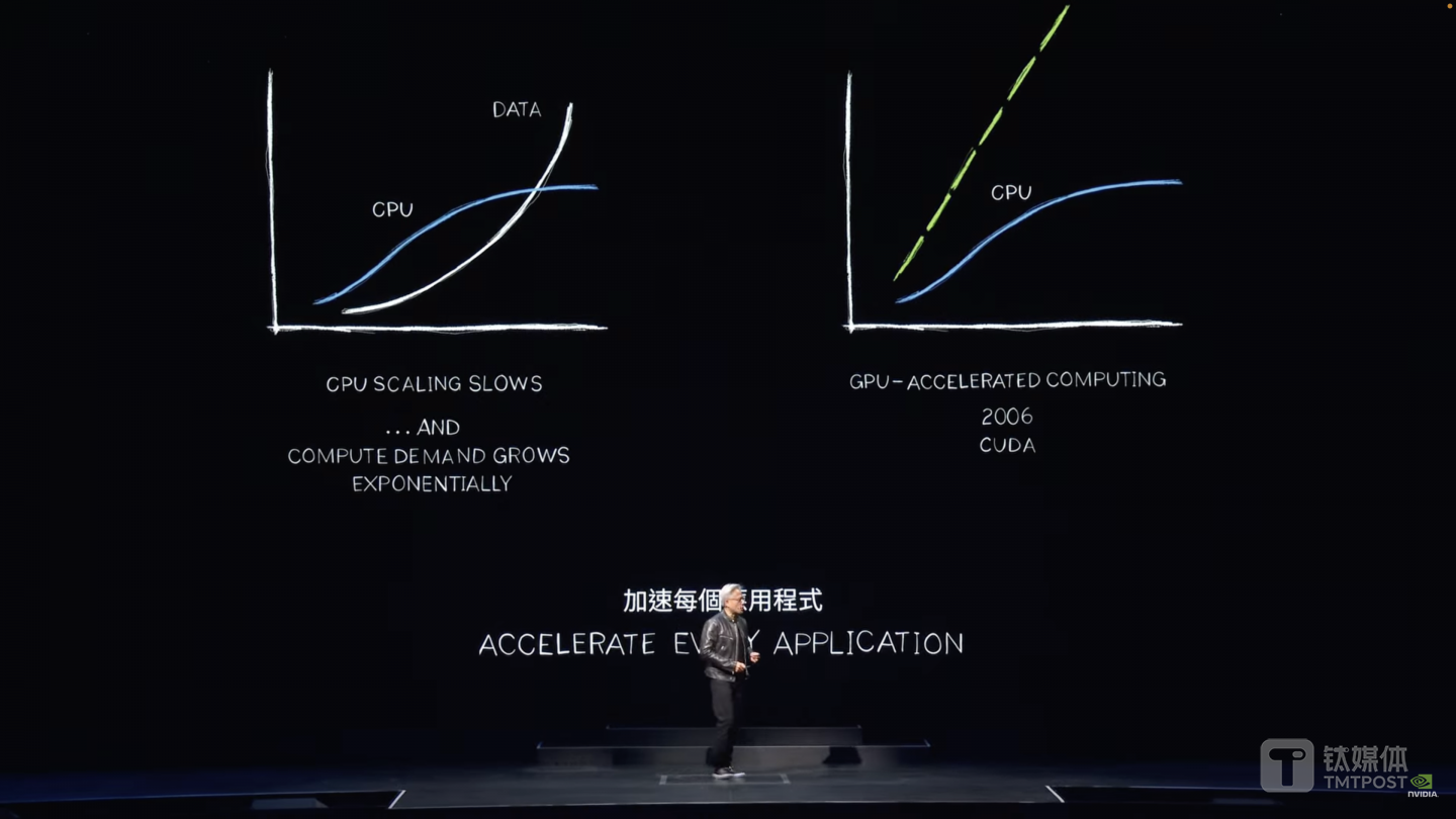 “我们正在看到世界各地使用的数据中心电力数量正在大幅增长,计算成本正在增长,而且看到了计算通货膨胀。当然,这不能再继续下去了。同时,数据将继续呈指数级增长,CPU性能扩展将永远不会恢复到之前状态。”黄仁勋称,“我预测,在不久的将来,每个处理密集型的应用程序都将加速,每个数据中心肯定都会加速。”