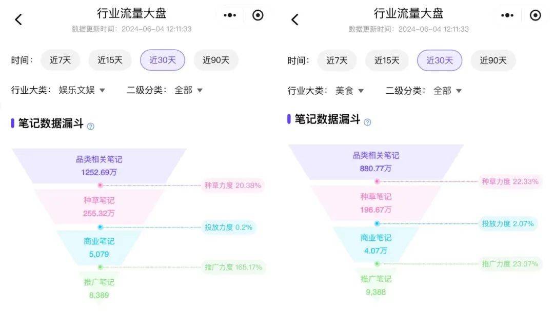 千瓜数据显示,近30天小红书娱乐文娱行业含有CPC关键词推广或信息流广告的推广笔记数量达到8389条,仅次于平台美食类目。