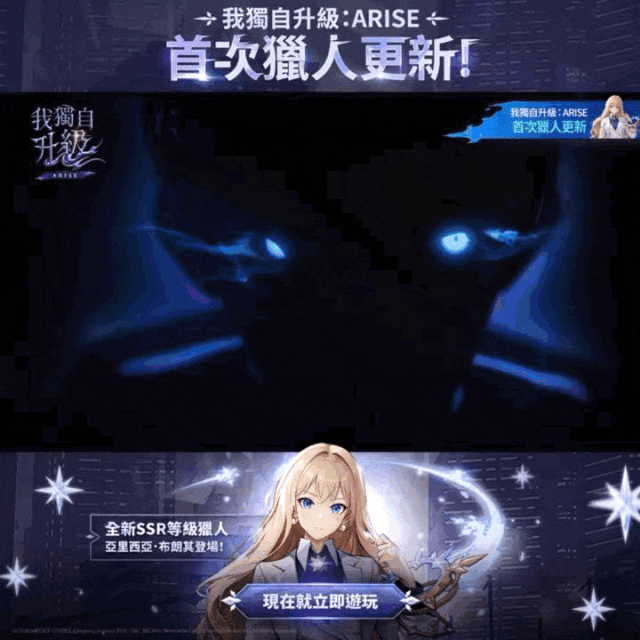 其二,着重凸显游戏美术特点;《我独自升级:Arise》的大部分素材,会在品牌向内容之中,加入黑紫色调,如此一来,则可以给玩家传播出一种颇具神秘感的素材调性,并且搭配素材中的怪物形象以及配套文案,可以让玩家产生“让我来试试”的冲击感。