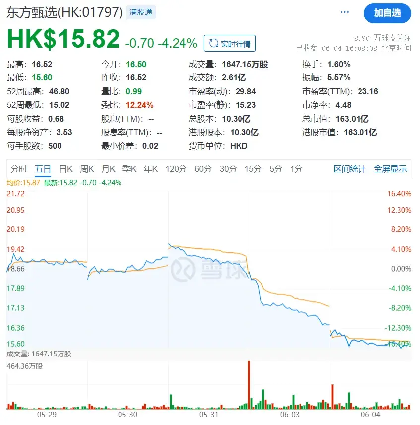 6月3日,港股东方甄选股价一路下跌。截至收盘跌幅达9.92%,市值由盘前的189亿港元减少至170亿港元,单日蒸发超18亿港元。到6月4日,东方甄选股价再下跌4.24%,报15.82港元。