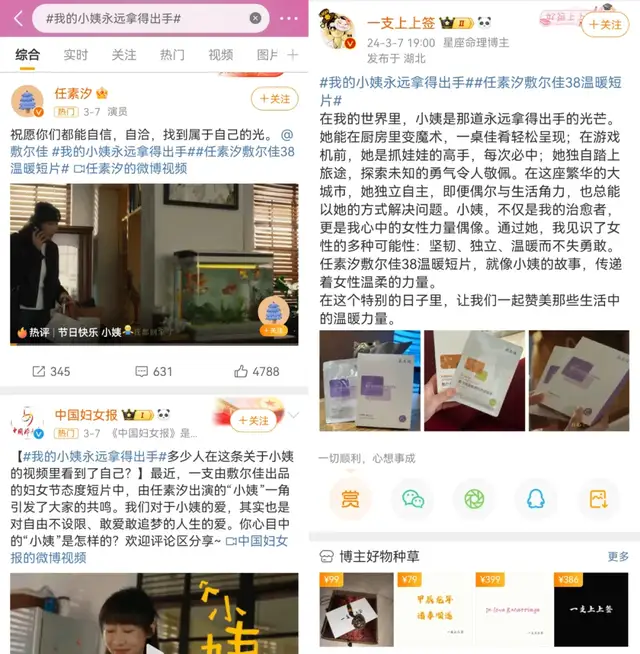 以敷尔佳为例,其3.8广告《小姨》便聚焦一个成熟又不失自由的女性形象,传递当前女性不被定义,不被束缚的特质。在#我的小姨永远拿得出手#的热搜下,大量女性用户表现出了强共鸣,也在潜移默化中完成了对品牌理念的深度认知。