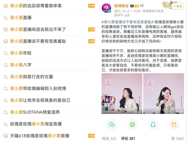 仅入淘后的两场直播,便诞生了#章小蕙的选品很尊重我审美#、#章小蕙直播间进去就出不来#、#头发护理原来这么细分#、#为什么小众护肤品火了#、#年轻人在直播间挖宝小众品牌#、#章小蕙直播谈不要有变美羞耻#等选品侧、主播言论相关的一众热搜话题。花式的曝光中,大量对章小蕙陌生的用户因为护肤、护发玩法对“玫瑰是玫瑰”IP建立认知,直播领域的“新人”也完成了一次显著进阶。