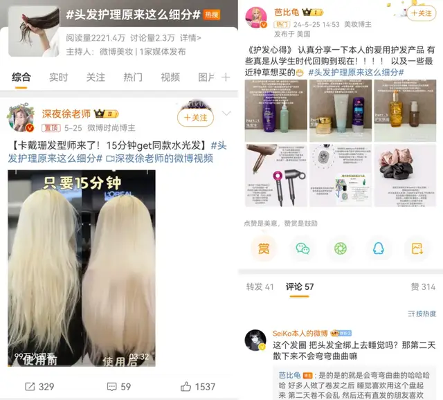 同样,随着洗护发市场的高速增长,护发领域也成为大量美妆品牌新一轮布局重点,雅诗兰黛旗下艾梵达,欧莱雅旗下薇姿、卡诗等品牌均在大陆市场加速营销步伐,高端洗护、头皮护理等细分话题也成为用户讨论的重点。#头发护理原来这么细分#的话题中,大量美垂达人分享护发细则、推荐宝藏好物,三明治法、卡戴珊同款水光发等内容下,大量网友加入如何养护、修补头发的探讨。