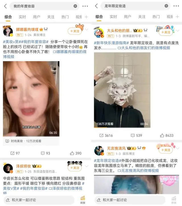 微博则进一步放大其热点优势,从《浪姐5》到《庆余年2》,高热度娱乐内容都会有对应的仿妆教程,明星妆容话题下,艺人化妆师也会“现身说法”,推荐“妆造技巧”和品牌使用教程。同时,“龙年限定妆造”、“我的年度妆容”这样的创意晒妆玩法也更容易引发裂变效果。