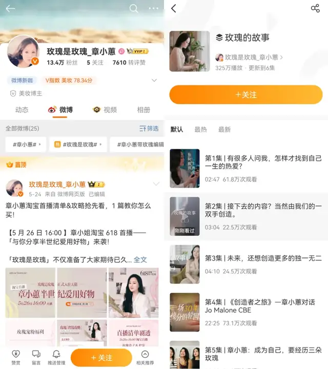 5月13日,“玫瑰是玫瑰-章小蕙”入驻微博,发布618期间的直播活动信息。同时,《如何找到一生热爱》《未来,还想创造更多独一无二》《章小蕙对话Jo Malone CBE》等玫瑰的故事系列短视频陆续发布,章小蕙团队在公域展开了IP“宣讲”尝试,借助更柔软的方式,@玫瑰是玫瑰-章小蕙 在不到一个月的时间内实现了13.4万的粉丝和超千万的IP内容播放,以“美妆博主”的身份,获得了更多新人关注。