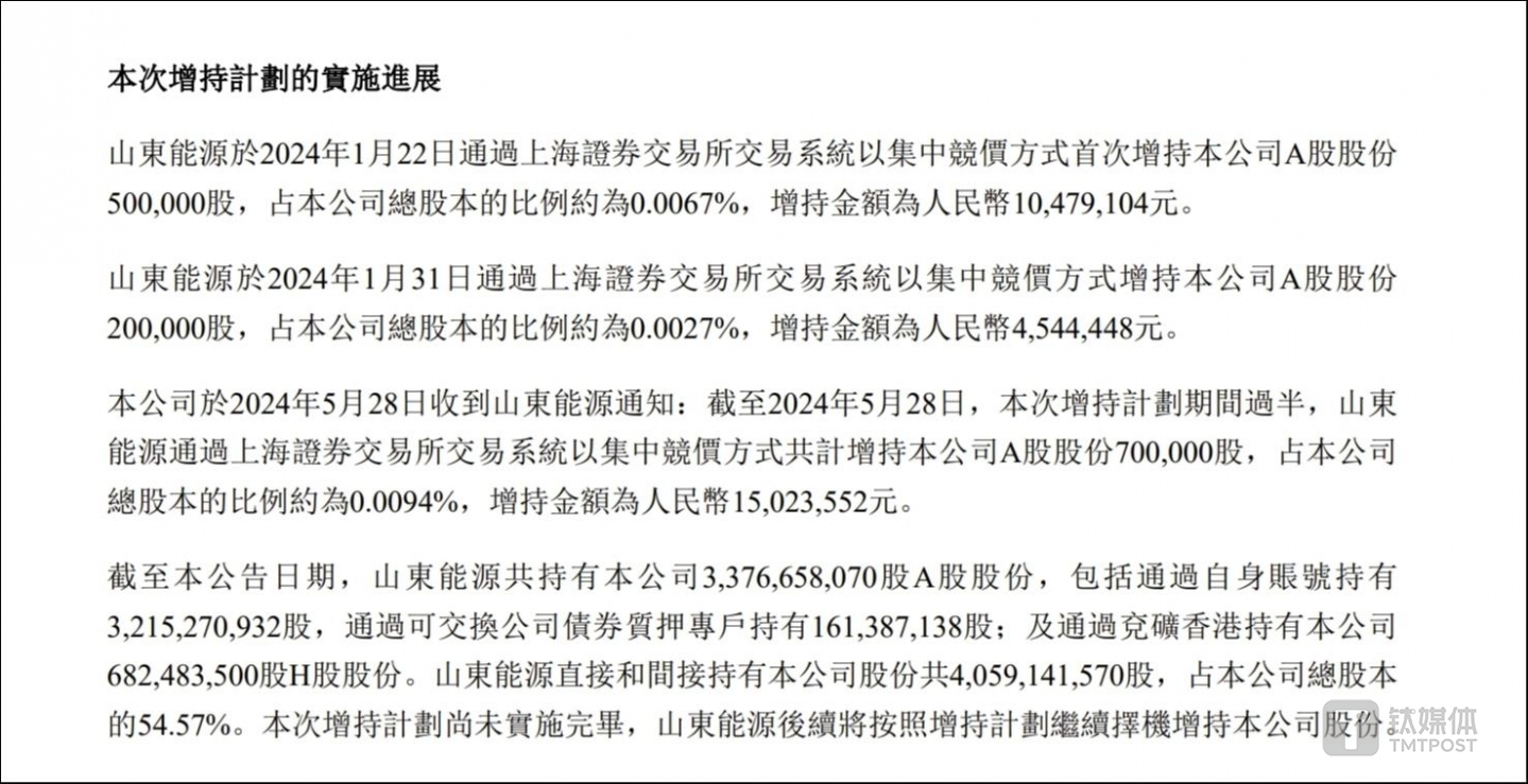 据悉,去年11月30日兖矿能源公告称,控股股东山东能源集团有限公司(下称“山东能源”)计划增持公司A股股份不超过2亿元、增持公司H股股份不超过4亿元。截至今年5月28日,山东能源已累计斥资1502.36万元增持公司A股股份,H股方面则通过兖矿香港间接持有公司6.82亿股H股股份。