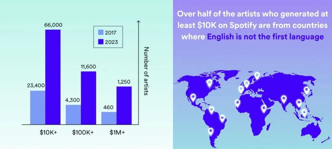 根据Spotify最新公布的年度Loud & Clear音乐经济报告,2023年约有66,000名艺术家在Spotify上赚取了至少10000美元的收入,其中一半以上来自英语不是第一语言的国家。西班牙语、德语、葡萄牙语、法语和韩语歌曲都表现优异,而印地语、印度尼西亚语、旁遮普语、泰米尔语和希腊语都出现了大幅增长。