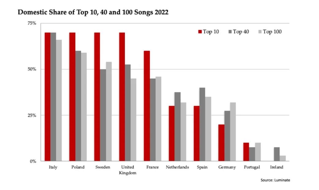 根据Spotify前首席经济学家Will Page的调研论文《‘Glocalisation’of Music Streaming within and across Europe》可以看到,通过对比欧洲音乐市场份额前10名的国家,将2022年各个国家的前100首热门歌曲按从属国家或地区进行细分,可以明显看出欧洲市场呈现较为激烈的全球本土化趋势。