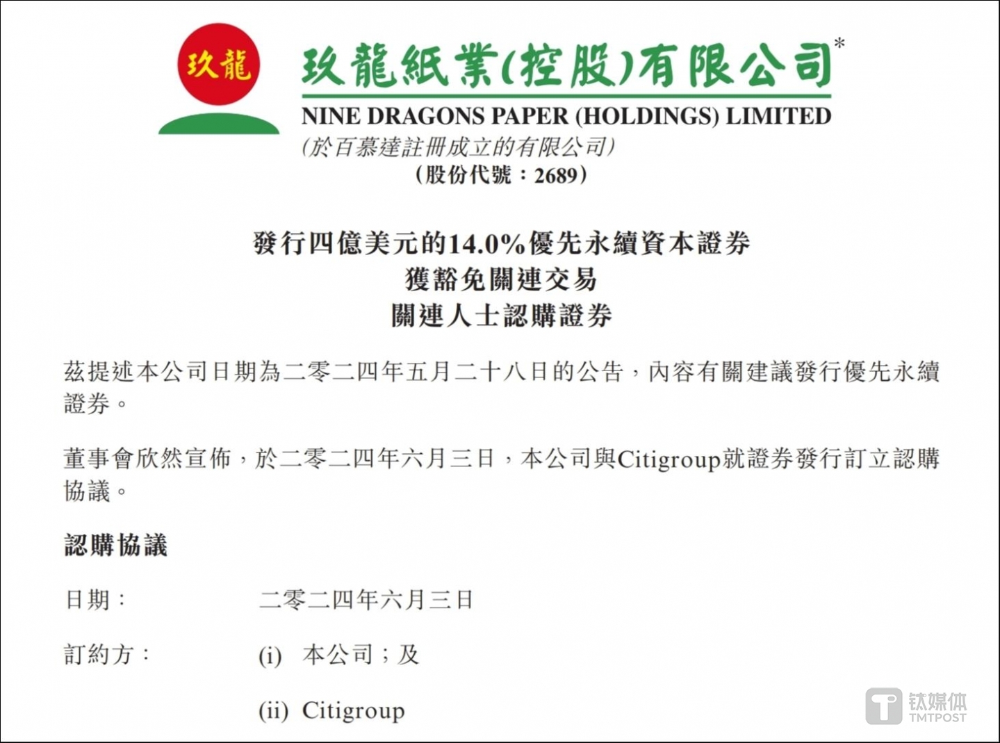 日前,造纸行业的龙头企业玖龙纸业(02689.HK)宣布,公司已与第三方发行机构签订了一份证券发行协议,将发行一只总价4亿美元的优先永续资本证券,年利率为14%,期限为三年,即2024年6月11日至2027年6月11日。