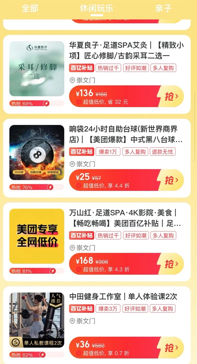 具体来看,特价团里聚合了从餐饮到休闲娱乐的众多本地生活服务,核心思路是以“超大牌+平台补贴”打造超低价心智,用强有力的商品折扣吸引消费者,场景则以“吃喝玩乐”等刚需高频为主。