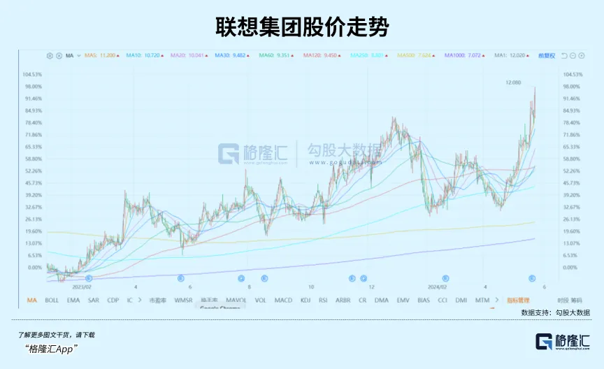 AI PC把联想、Dell、Hp这些公司推上了新的高度,即使微软自身,也推出了新的搭载AI功能的电脑surface。过去一个月,联想集团的股价已经上涨接近一倍,催化的主要因素,正是AI PC。