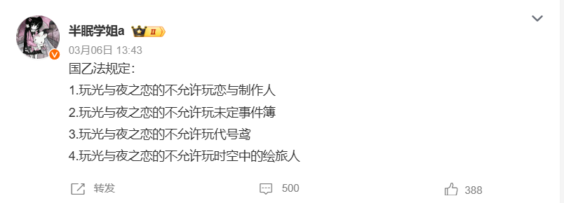 即使不玩乙游的人,多少也听过“国乙法”的存在。它的出现,与前文我们提到的“恋爱中的排他性”有关。国乙玩家构成复杂,有人冲着抽卡、有人为了休闲,还有人是真的冲着在游戏获得情感代偿来的。