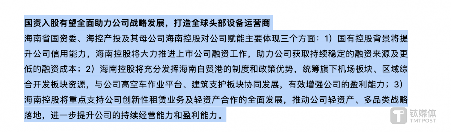 据悉,华铁应急主要从事设备租赁业务,提供建筑维保设备、建筑支护设备和工程机械设备租赁及配套服务。对于海南国资入主华铁应急的原因,光大证券曾在研报中指出,海南控股将充分发挥海南自贸港的制度和政策优势,统筹旗下机场板块、区域综合开发板块资源,与公司高空车作业平台、建筑支护板块协同发展。