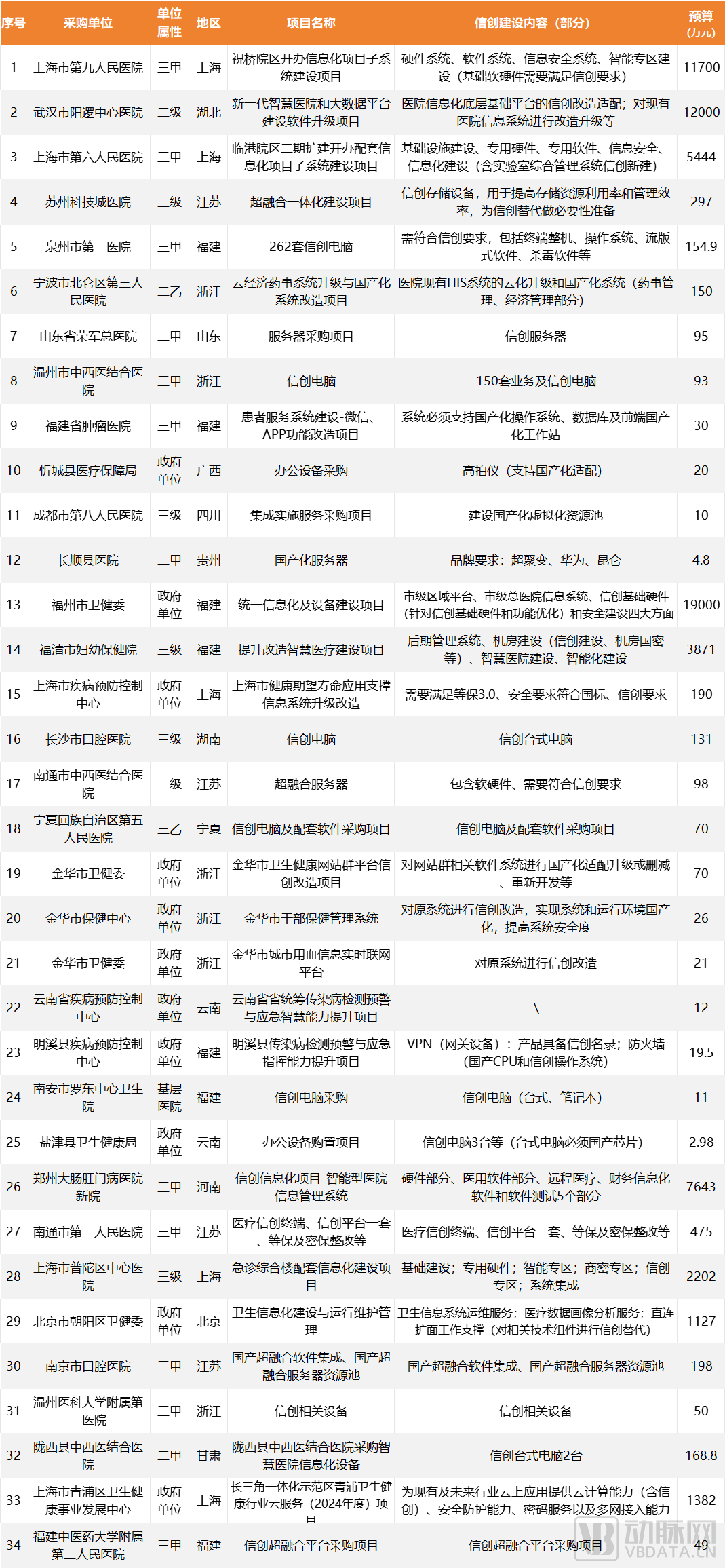 4月18日,福州市医疗机构发布信创相关信息化及设备建设项目,金额达1.9亿元,创历史新高;进入5月,再次诞生两个亿元级信创大单,分别由武汉市阳逻中心医院和上海市第九人民医院发出。据动脉网不完全统计,仅在2024年前5个月,各地医疗系统公开的信创及信息化采购需求总额金接近7亿元。