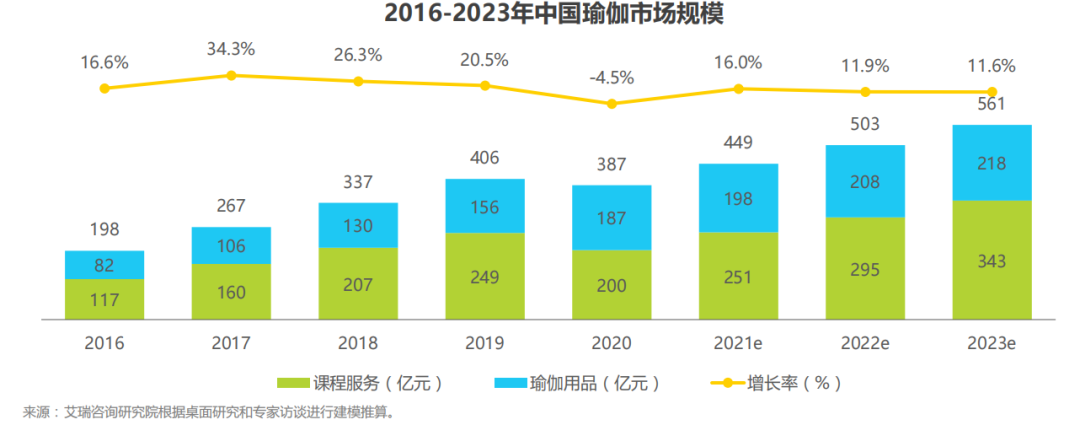 艾瑞咨询数据显示,2016-2021年,国内瑜伽行业市场规模增长了251亿元。2023年瑜伽行业规模预计达到561亿元,年增长率达到11.6%。