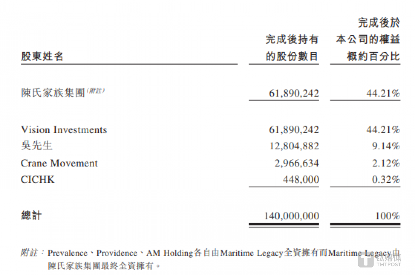 陈氏家族集团(陈德胜连同陈太太(陈先生的配偶)、陈劭翔先生(陈德胜及陈太太的儿子)及陈依琦女士(陈德胜及陈太太的女儿),以及彼等各自的全资投资控股公司,即TS Chen Holding、Search&Search、JC Righteous及Avermay,其将通过Maritime Legacy(一家由上述投资控股公司拥有的公司)以及Prevalence、Providence及AM Holding)和Vision Investments均分别持有德翔海运44.21%的股权。